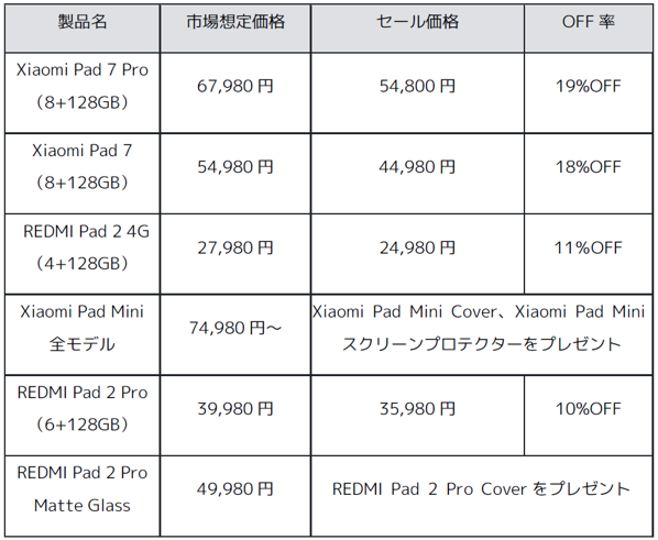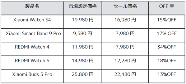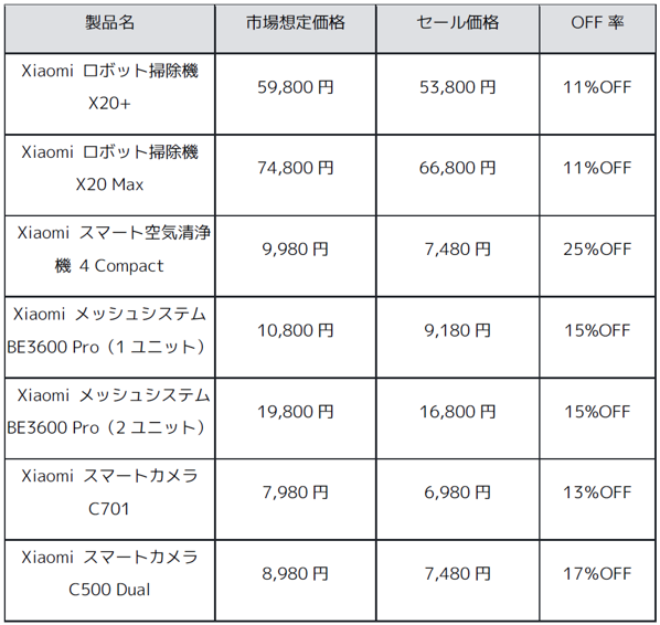 スマートホーム製品では、高い吸引力と自動集塵を備える Xiaomi ロボット掃除機 X20+、Wi-Fi 7対応の Xiaomi メッシュシステム BE3600 Pro、4K UHDで家を見守る Xiaomi スマートカメラ C701 など、生活を効率化する人気シリーズを割引価格で販売します。
