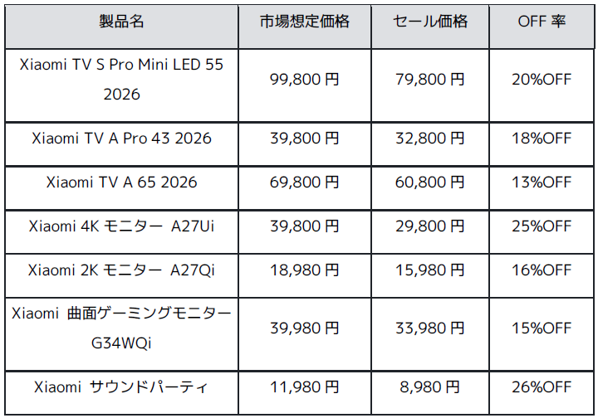 またテレビ・ディスプレイ製品では、Mini LEDを採用した Xiaomi TV S Pro Mini LED 55 2026、高精細4K表示の Xiaomi 4K モニター A27Ui などがラインナップ。ゲーミング用途にも活用できるモデルが特別価格で提供されます。