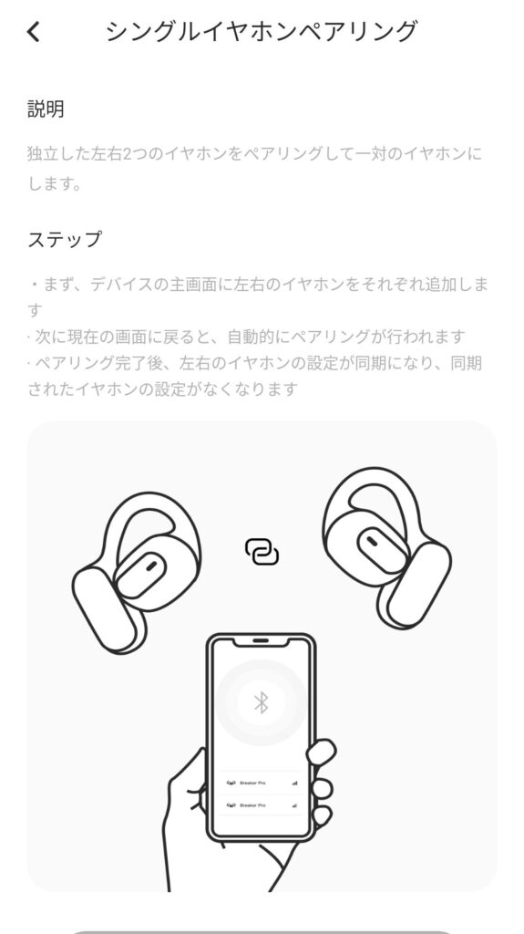 個人的に珍しいなと思ったのはシングルイヤホンペアリング機能で、要するにイヤホンが左右2つバラバラに登録されている場合に1つのデバイスとして同期できる機能です。ピンと来ない方もいらっしゃるかと思いますが、ワイヤレスイヤホンには意図せず左右が分割されて認識されてしまう場合があります。最近のワイヤレスイヤホンの多くは左右で独立した信号が送られていて、それを左右で同期する事で1つのデバイスとして認識される仕組みです。この仕様により片耳使用が出来たりする訳ですが、反面この同期が上手く動作しないと左右別々で検出されてしまい、片側しか使えない・左右でペアリングできない、といった事象が発生してしまう事があります。初期化すれば治る場合もありますが、初期化してもなかなか治らないケースもしばしば。そんな時にこの意図的にペアリングできる機能があれば左右のペアリングトラブルを一瞬で解決する事が可能です。