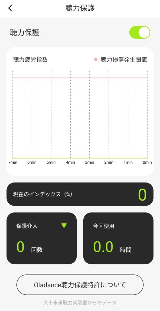 『聴力保護』ではスイッチをONにすることでリアルタイムでモニタリングし、聴力に影響のある可能性がある場合は自動調整してくれるのだそう。私の場合は試しにボリュームをかなり上げても自動調整が入らなかったので詳細は不明ですが、おそらく過度なボリュームが検知されると自動調整され、保護介入の部分でカウントされる仕組みだと思われます。