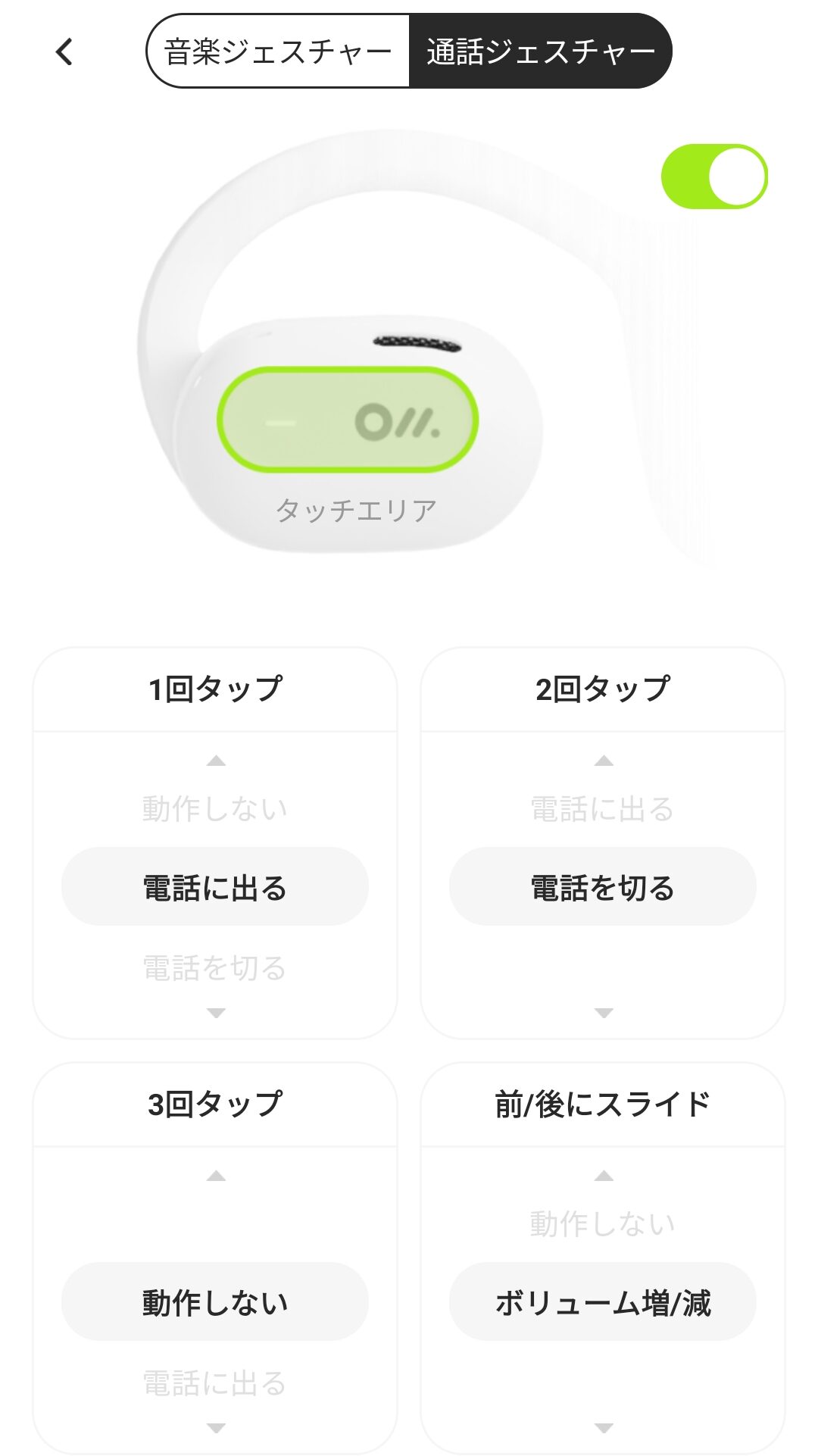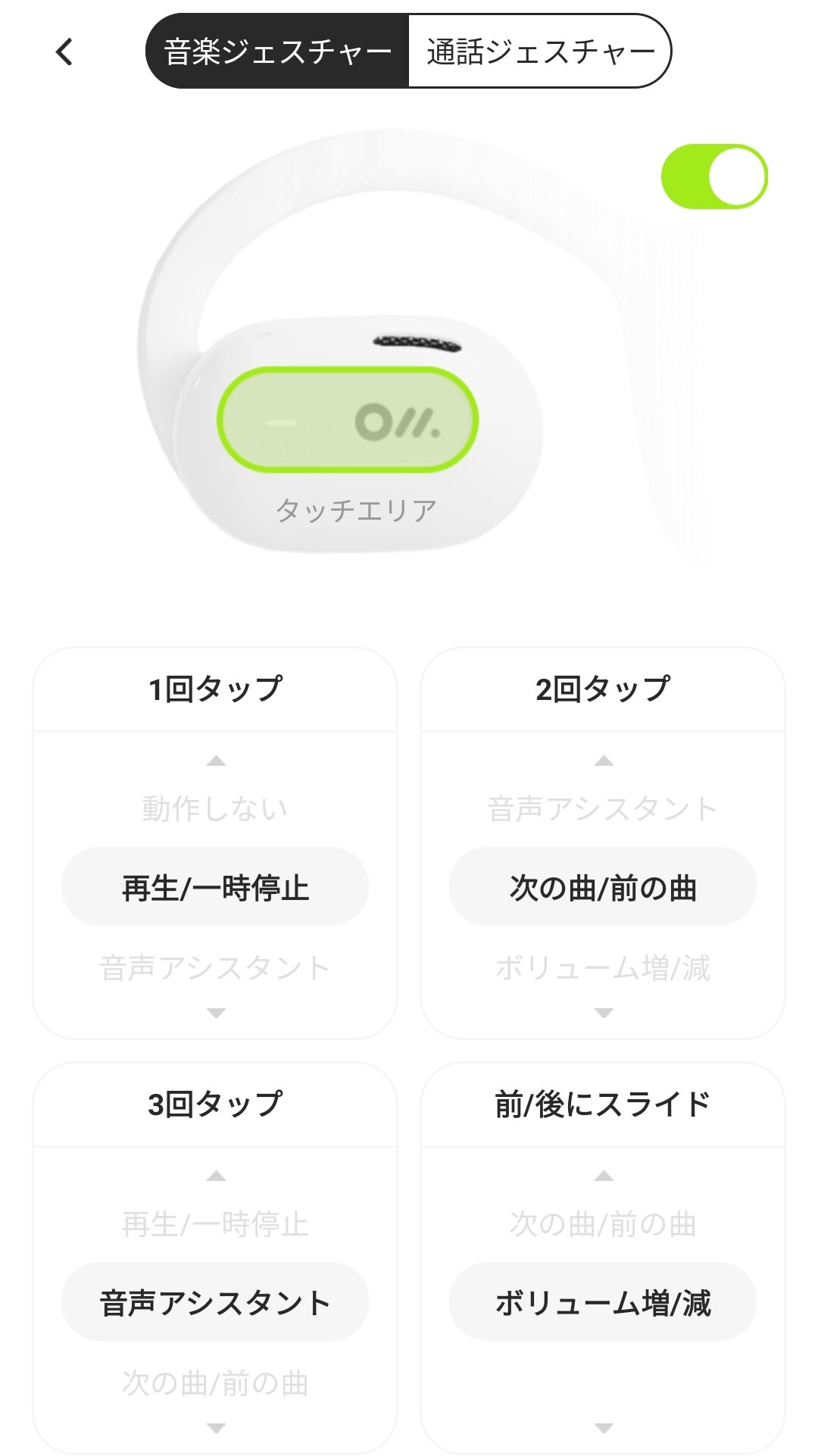 音楽再生時の他通話時のコントロースカスタムも可能です。スライド操作には曲送り/曲戻しかボリューム増減を割り当てられ、タップ操作以上に直感的な操作が可能です。