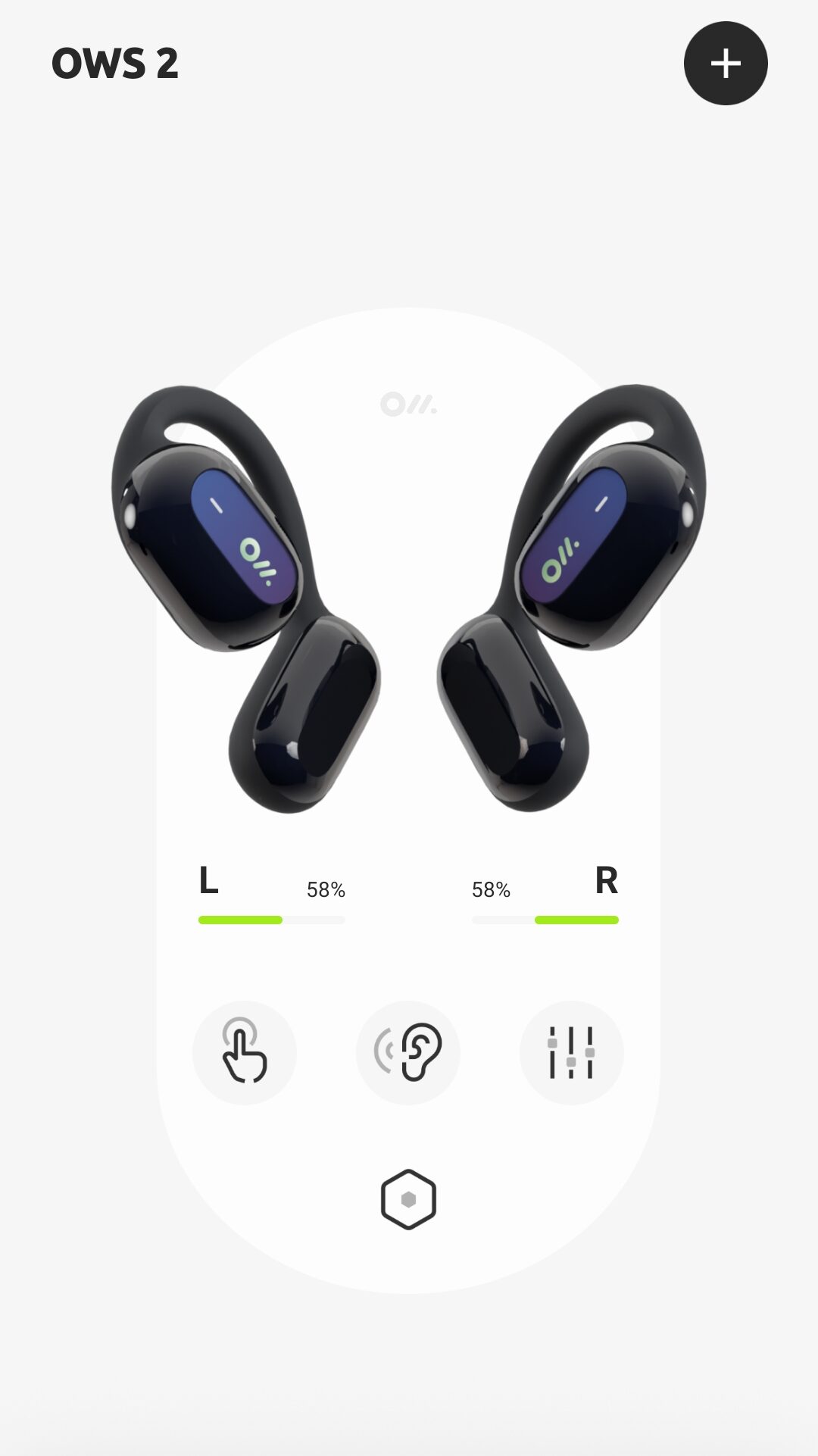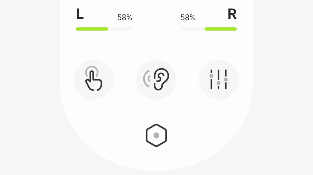 専用アプリホーム画面ではバッテリー残量表示の他、コントロールカスタマイズ、聴力保護設定、イコライザー設定、設定項目が設けられています。