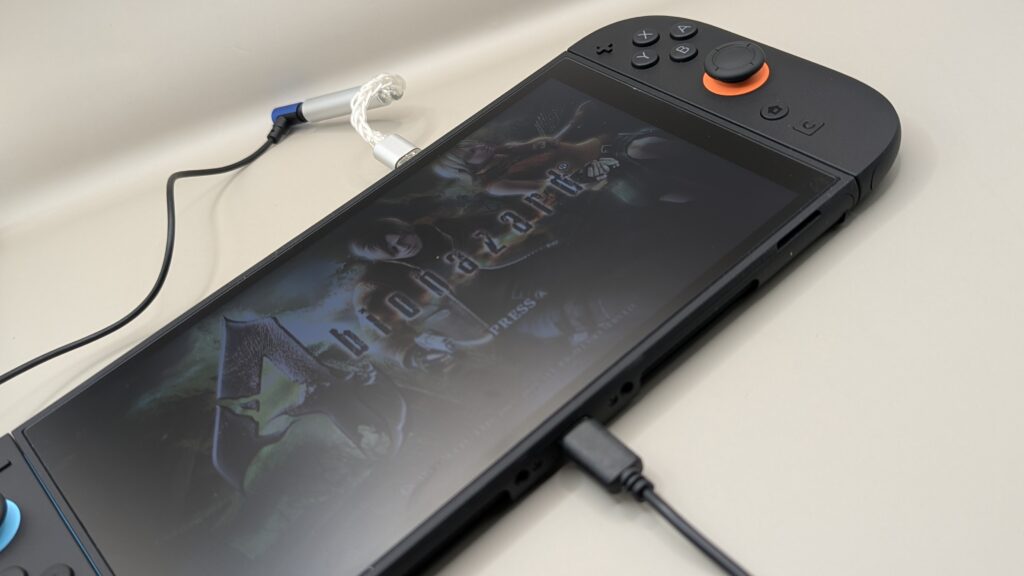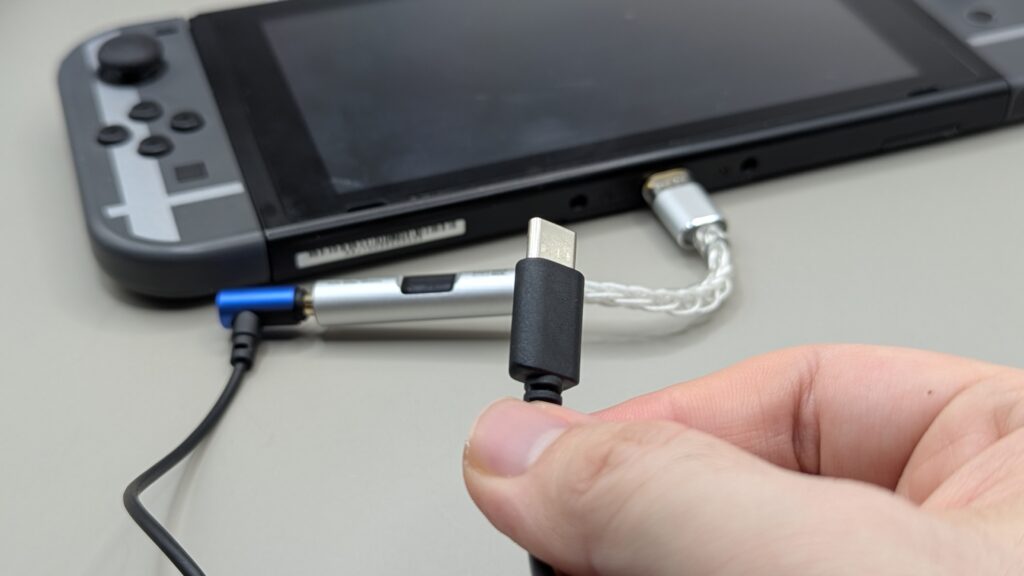 旧Switchや有機ELモデルは本体にUSB-Cポートが1つしか搭載されていない為、DAC接続時はそのままでは充電できず、充電の減りが早くなってしまうのが痛手でしたが、Switch 2はUSB-Cポートを上下に2つ搭載しているため、DACを接続してももう1つのポートで充電可能です。携帯モードでもドック接続時でも、充電しながら高音質で使用できます。