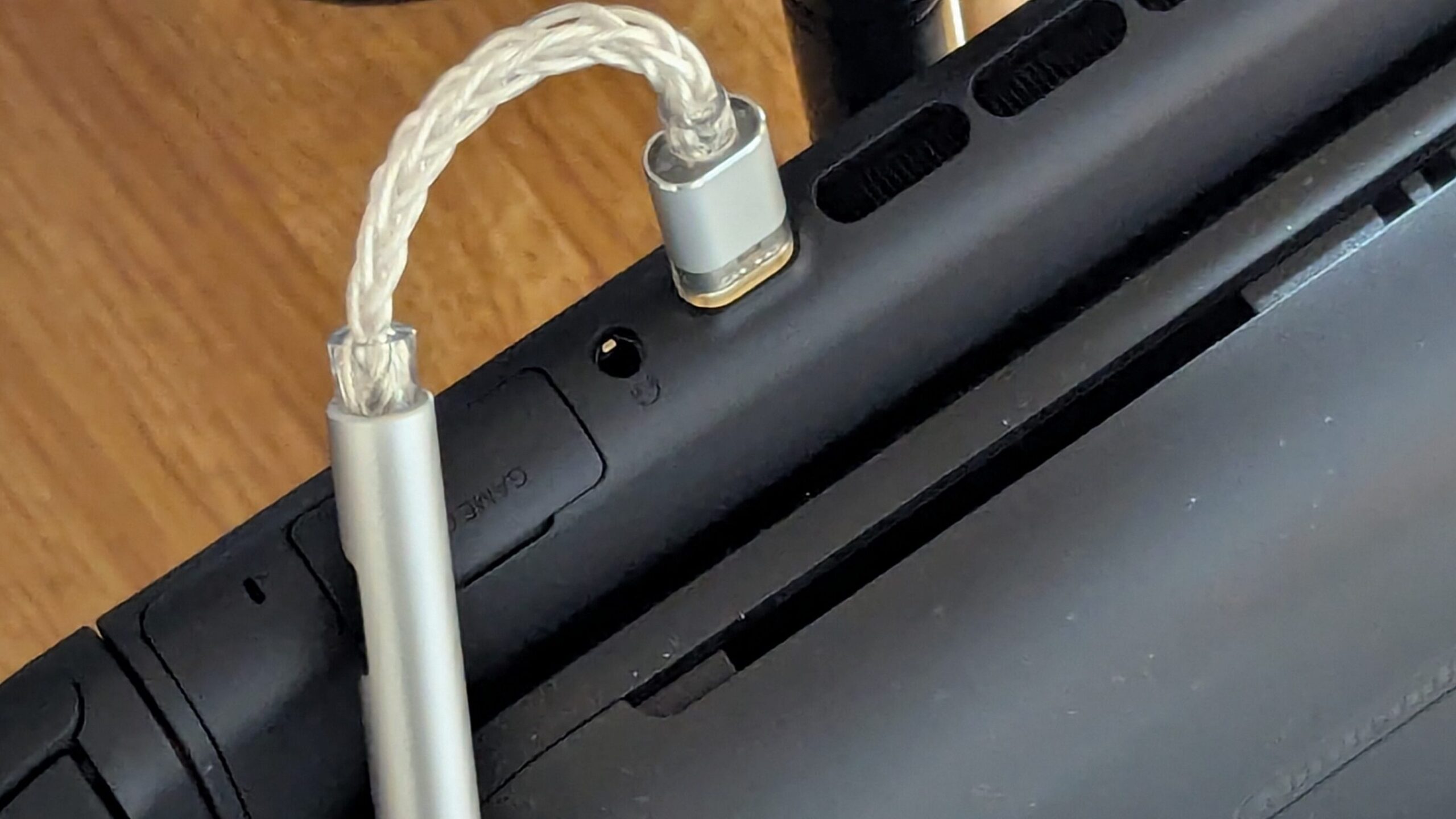 ドック接続中でもDACを上側USB-Cポートに挿すことで、充電しながら高音質で据え置きプレイ可能です。