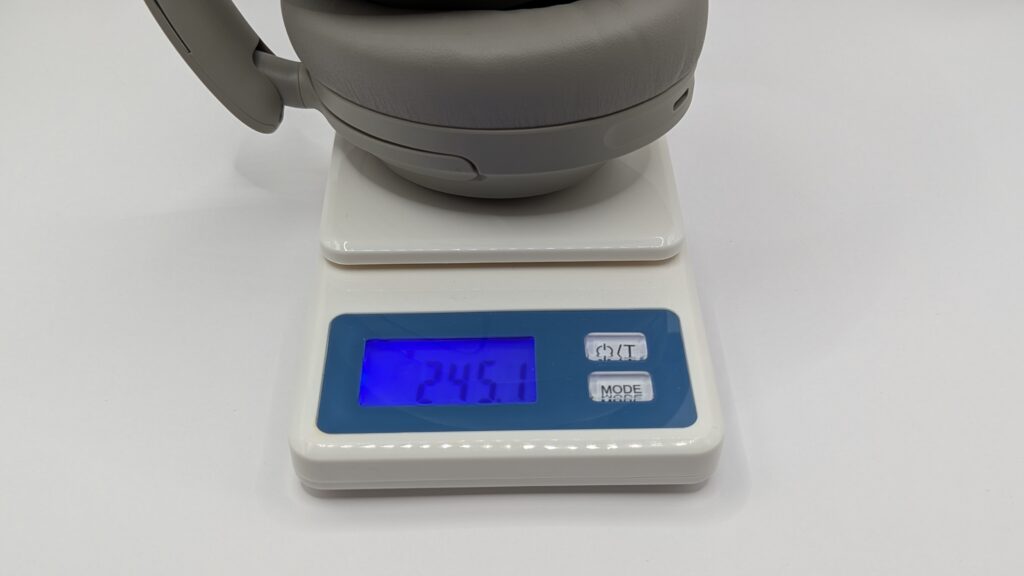 ヘッドホンの重さは実測値で約245gで、競合ブランドのオーバーイヤー型ワイヤレスヘッドホンが大体280g前後なので非常に軽量と言えます。たった30~40g程度の差ですが、ヘッドホンだとこの差は体感でかなり違いが感じられます。