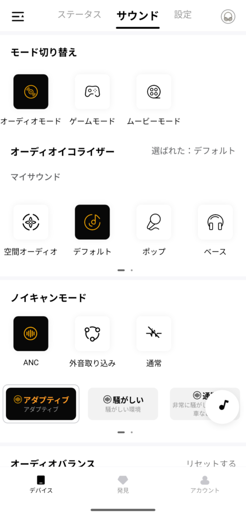 『サウンド』タブではイコライザーやノイキャンモードの設定、オーディオバランス調整を行う事ができます。