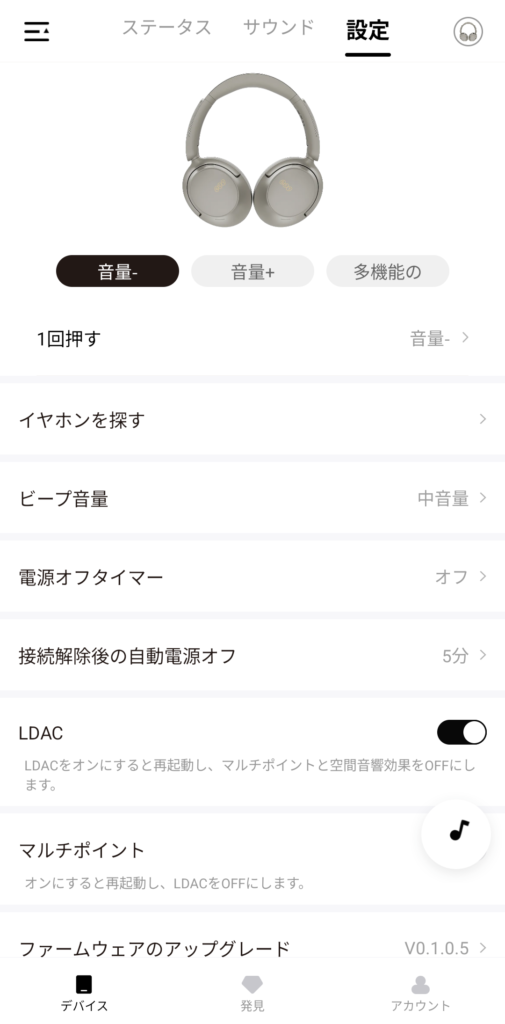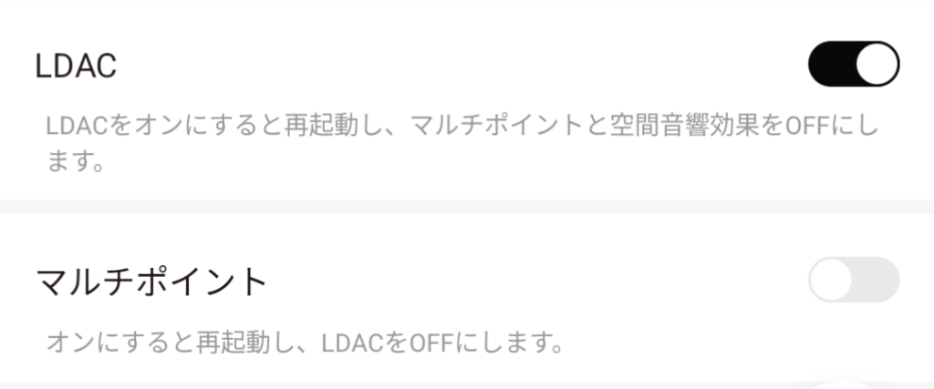 マルチポイント、LDACの適用もこのタブから行います。同ブランドの最新ワイヤレスイヤホンとは異なりLDACとマルチポイントは併用不可です。