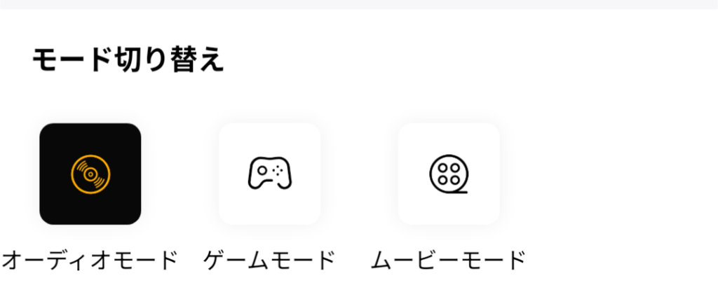 『モード切り替え』で『オーディオモード』『ゲームモード』『ムービーモード』をアプリから切り替える事ができます。