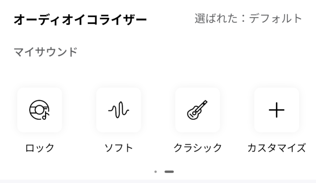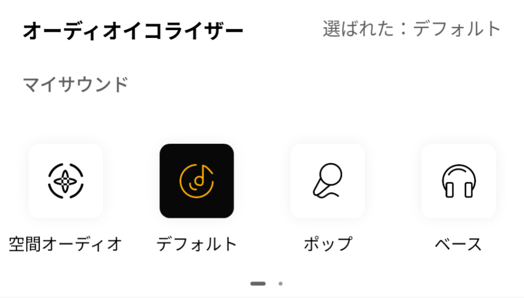 イコライザーはデフォルトを除く設定済みの基本的なプリセット5種と自分で細かく調整可能な『カスタムEQ』に加え、『空間オーディオ(疑似空間拡張)』にも対応しています。