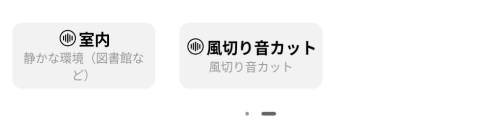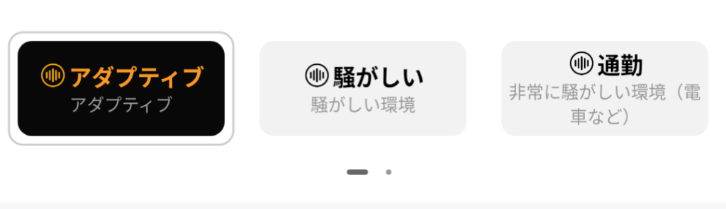 『アダプティブ』は環境に適した具合に自動調整される適応型ノイズキャンセリングで、『室内』『通勤』『騒がしい』の3項目はそれぞれ3段階で効力を調整可能です。風が強い屋外等では『風切り音カット』を使用する事で適応型や各ノイキャンでは減衰できない風が当たる音を効果的に除去してくれます。