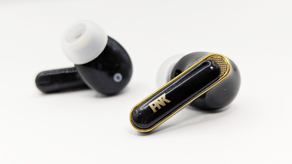 イヤホン本体はスティック型で、ブラック×ゴールドのカラーリング。
