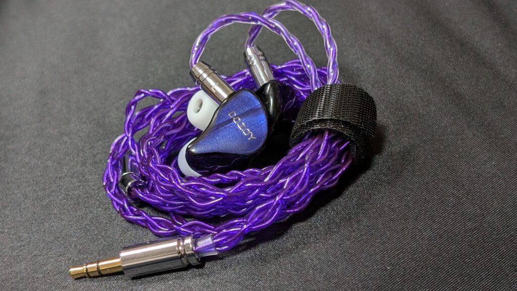 まず目を引くのが鮮やかなパープルカラーのケーブル。金属スリーブ採用で高級感があり、柔らかく取り回しも良好です。