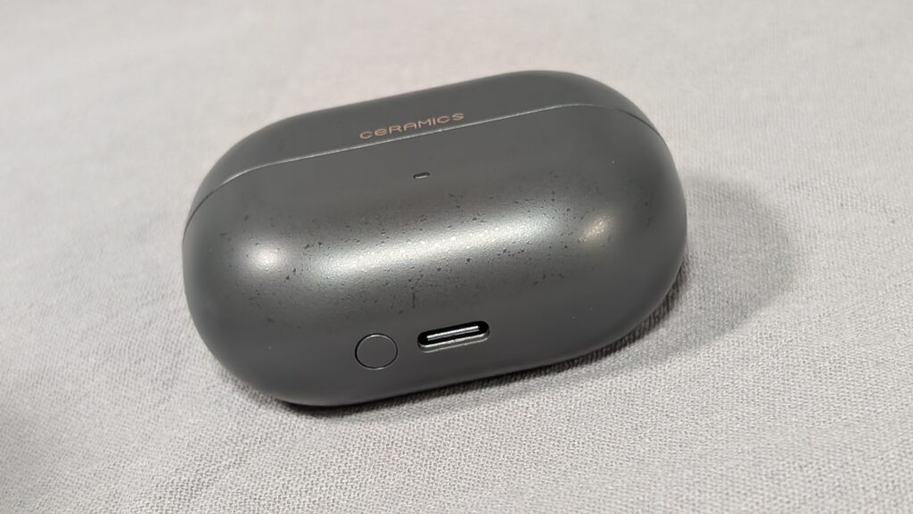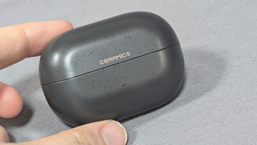 定番の丸みを帯びた横長形状で、指紋が付きにくいマット仕上げでシボ塗装のような加工が施されています。ケース前面には状態を示すインジケーターを搭載。底面には充電ポートとペアリングリセットボタンを備えています。フタは90°まで開いてしっかり保持されます。