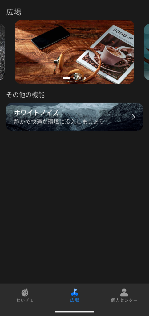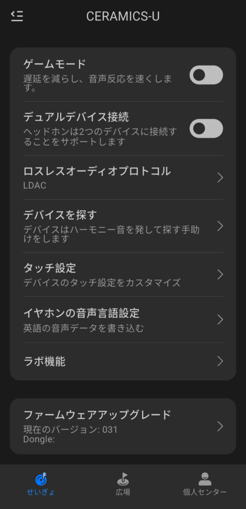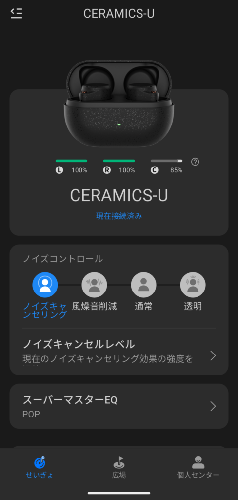 アプリは大きく「制御」「広場」「個人センター」の3タブに分かれており、イヤホン関連の機能はすべて制御タブに集約されています。