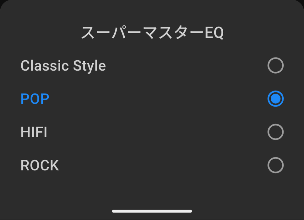 - イコライザー:プリセット4種類から選択可能(カスタムEQは非対応)