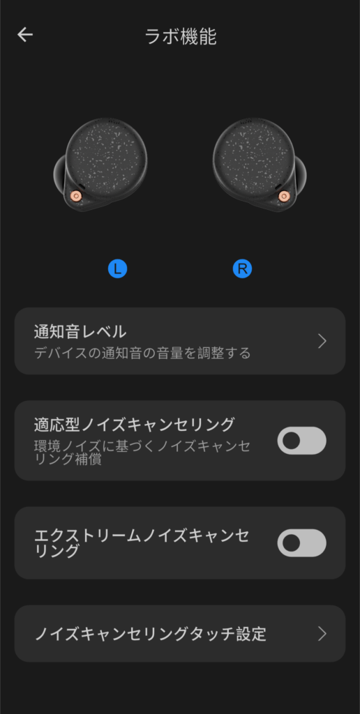 - ラボ機能:通知音量4段階調整のほか、「アダプティブANC」や「エクストリームノイズキャンセリング」といったより強力なノイズキャンセリングモードも利用可能(※これら2種はアプリからのみ有効化可能で、本体ボタンへの割り当ては不可)